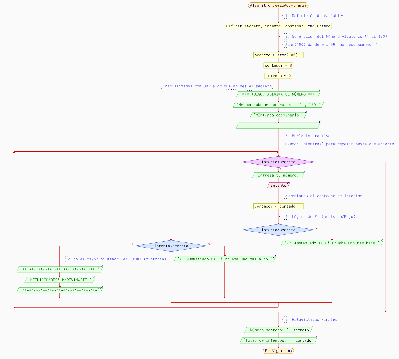 A diferencia de una tabla de multiplicar (donde sabemos que son 10 vueltas), aquí no sabemos cuántos intentos necesitará el usuario. Usamos la estructura Repetir... Hasta Que para mantener el juego vivo hasta que el jugador acierte.